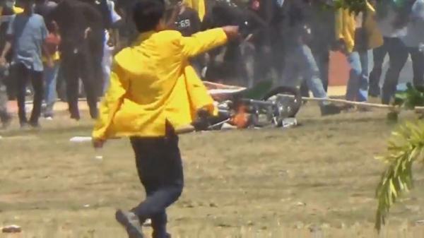 Dari kejauhan, mahasiswa kemudian melempari polisi dengan batu. Namun barikade polisi dilengkapi dengan perlengkapan antihuru-hara, termasuk tameng. Massa yang kesal kemudian membakar satu unit motor yang diduga milik anggota kepolisian yang parkir.
