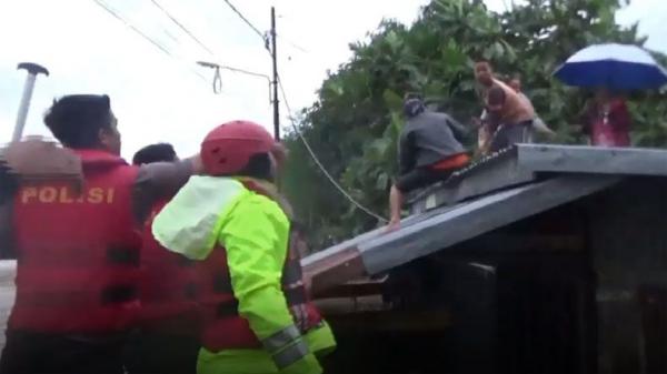 Tim SAR gabungan langsung menyisir untuk mencari dan mengevakuasi warga yang terjebak banjir. Proses evakuasi warga yang terdiri dari ibu-ibu dari atas atap pun berjalan dramatis.