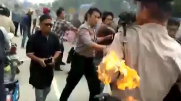 Namun api telah tersulut, diduga Iptu Muis terkena siraman bensin hingga api berkobar membakar bagian lengannya. Iptu Muis coba memadamkan api dan tampak berlarian menahan rasa sakit hingga akhirnya dibantu anggota lain. Suasana demo pun mendadak semakin kacau dan menjadi ricuh.