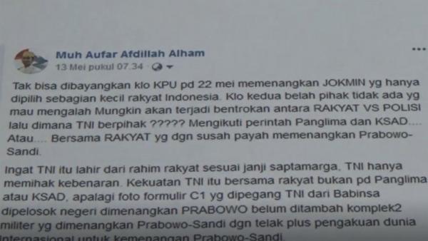 Dalam unggahannya, pelaku menulis mengenai ajakan people power pada 22 Mei 2019 dengan konten “Kami tidak perlu capek menunggu kesiapan KPU karna semua juga pun sia-sia. Karna kami jauh lebih siap untuk people power tanggal 20-22 Mei 2019. Diperkirakan memakan 200 korban jiwa nanti”.